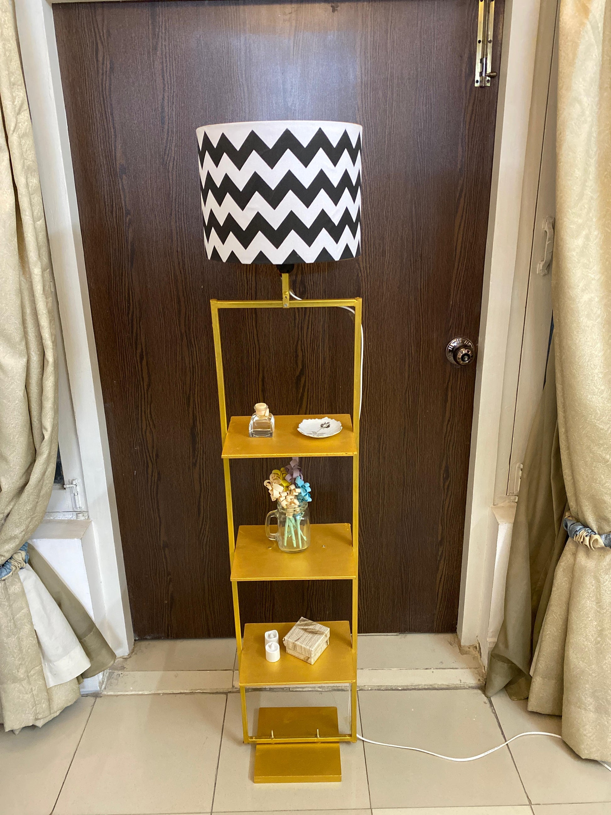 Elevate your space with this stunning, multifunctional 5.5 foot tall lamp. Crafted from a harmonious blend of metal, MDFm fabric, this lamp exudes timeless elegance. The shelves provide very useful space to showcase arunuments , gifts, frames etc. The golden hue casts a warm and inviting glow, creating a serene ambiance. With a versatile design, it seamlessly complements various interior styles. The 12-inch diameter shade provides ample, diffused lighting, perfect for reading, relaxing, or setting the mood. Experience the perfect fusion of form and function with this exceptional piece.